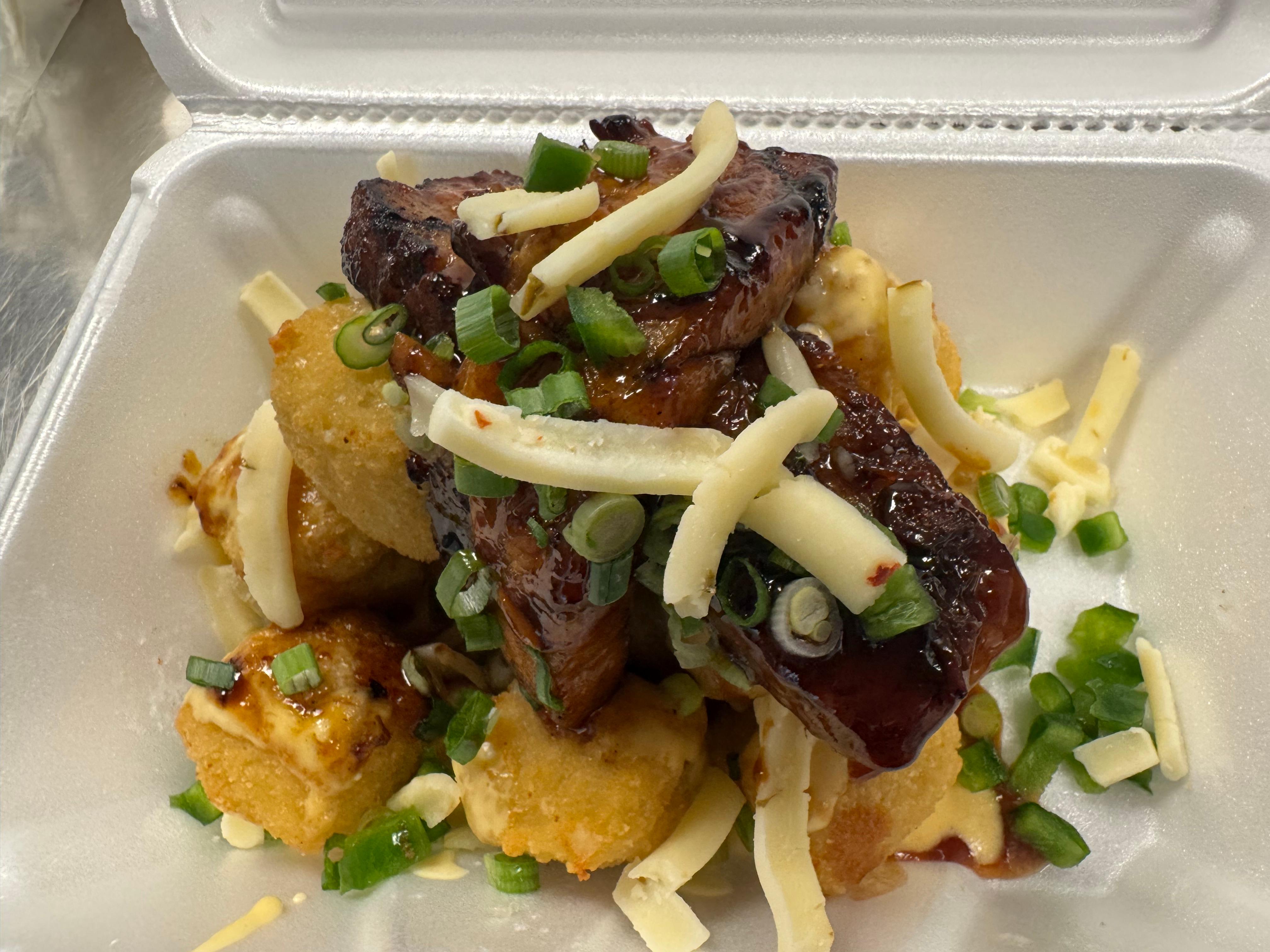 Beef bulgogi served over fries, topped with mozzarella cheese, caramelized onion, green onion, ketchup, Japanese mayo, and sesame seeds
