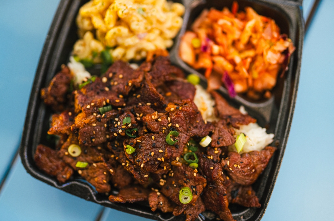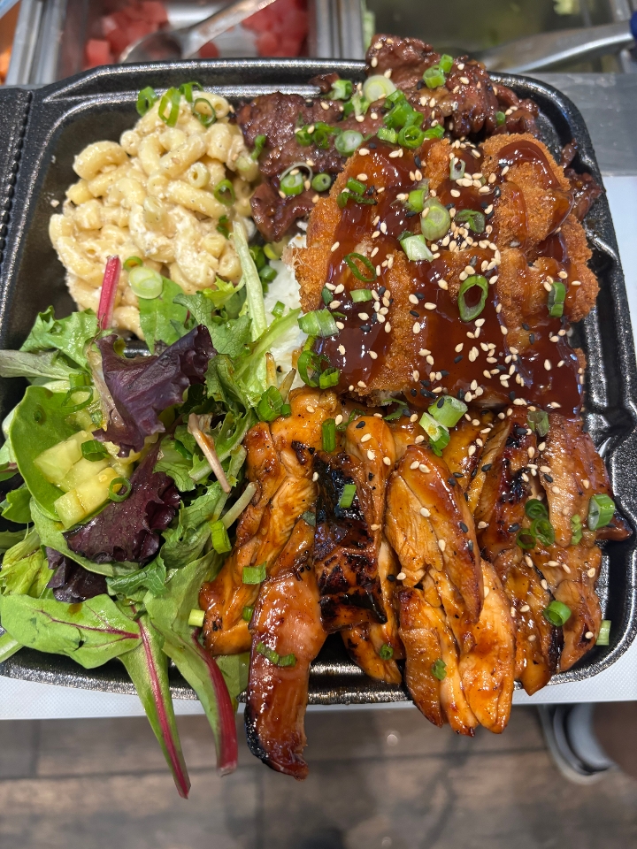 Enjoy a heaping serving of butter garlic fried rice, you can add Teriyaki/huli huli chicken, teriyaki/bulgogi steak or shrimp at an additional cost.