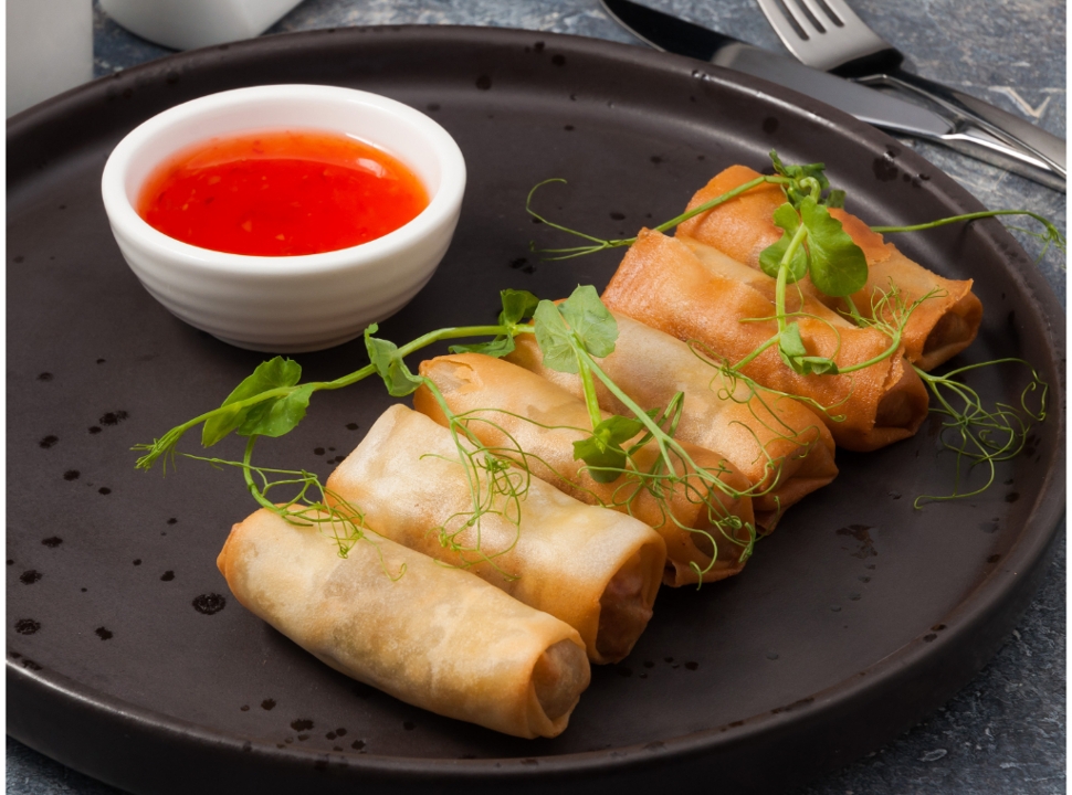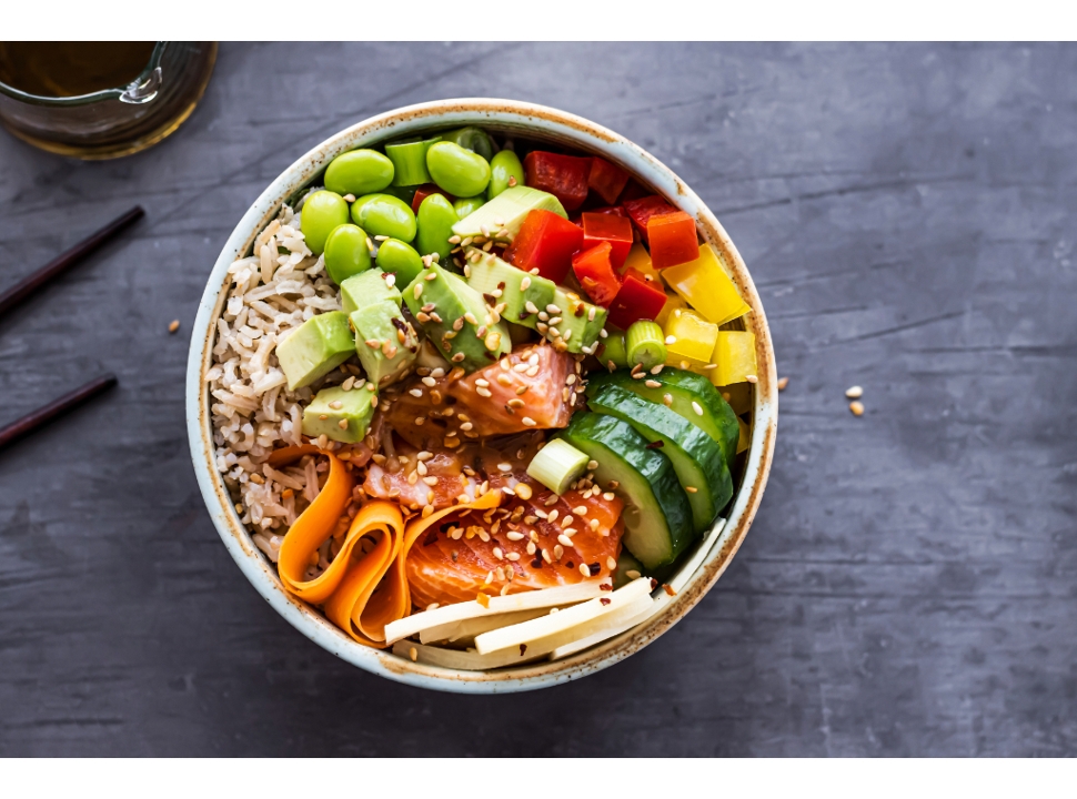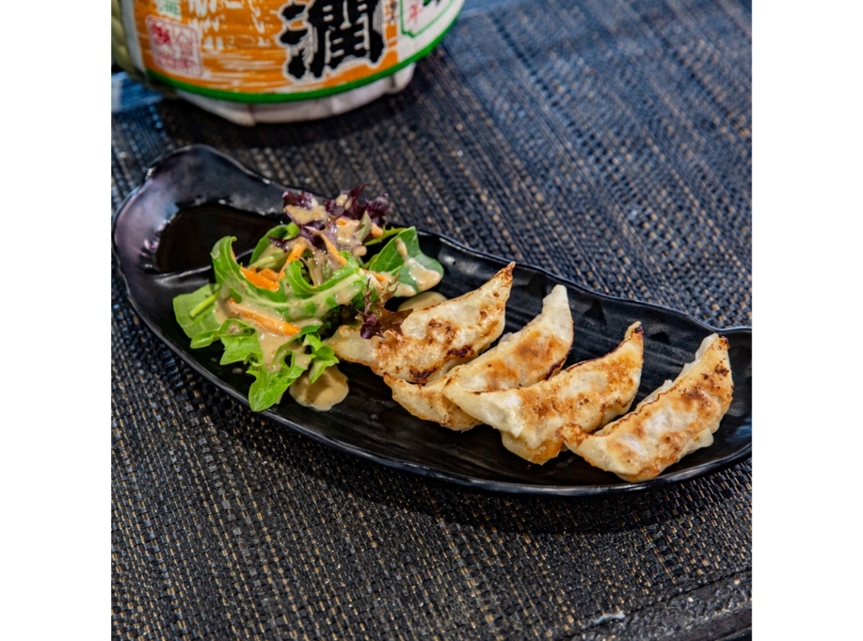 Sunset sauce, red onions, green onions, cucumbers, mango, crab salad, edamame, and tempura pearls
