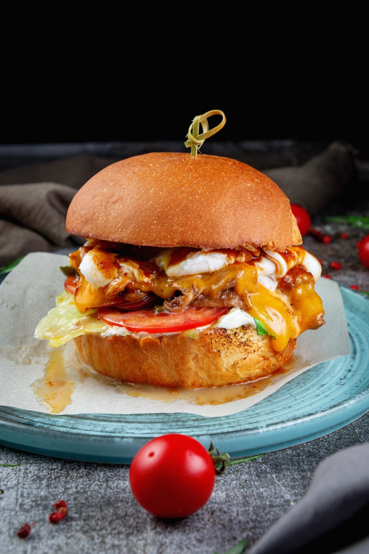 Double patty smash burger, American cheese, grilled onion, mushroom, fried egg, green onion, and sesame seeds, served with a side gravy