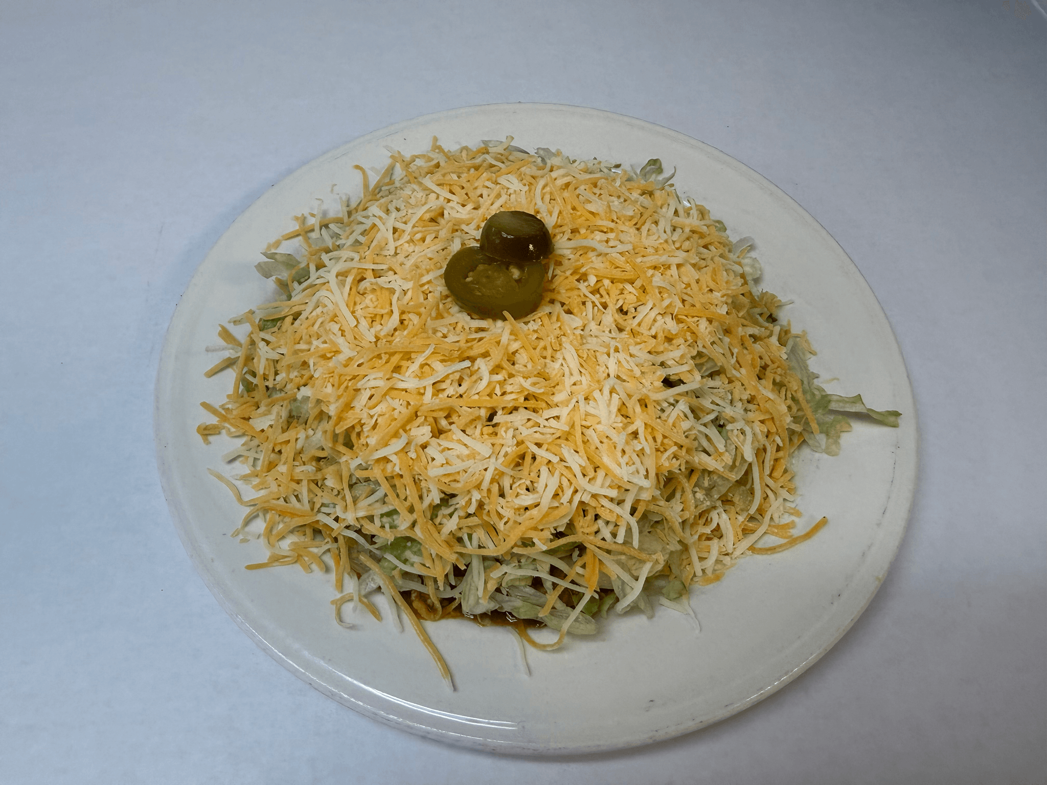 Large flour tostada with beans, your choice of meat, lettuce, cheese & jalapeños