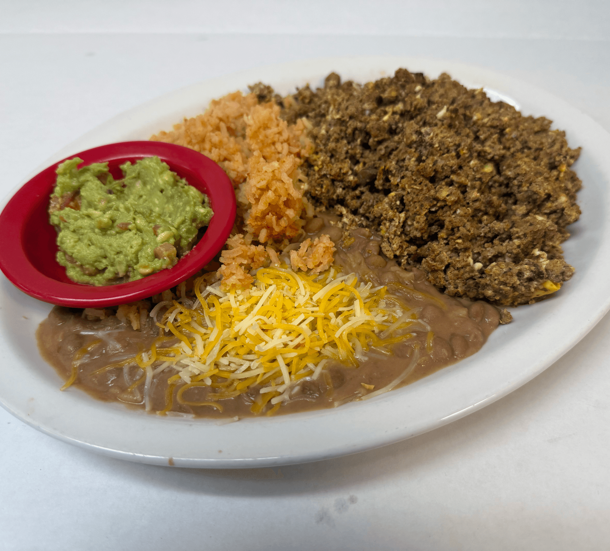 One tamale topped with chile con carne, one cheese enchilada, one bean tostada, one beef taco & guacamole. Served with beans and rice