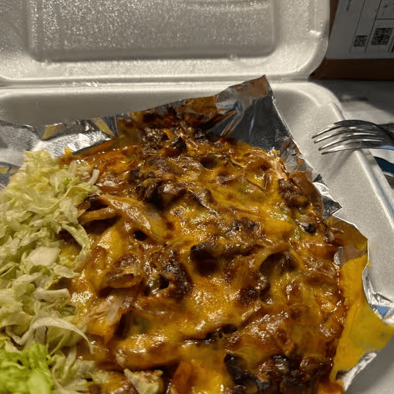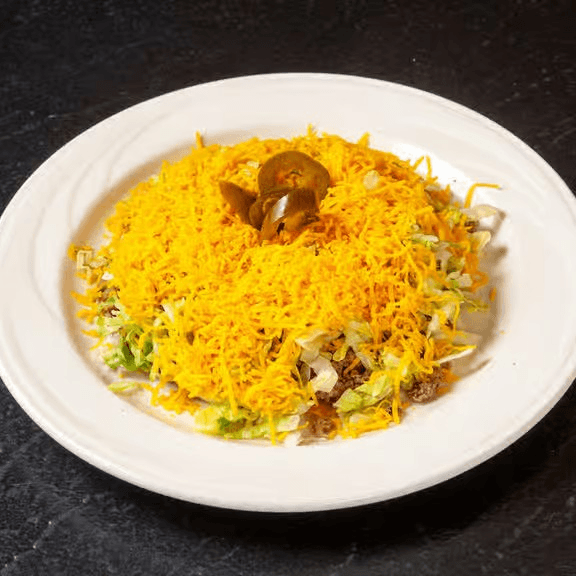 Crispy tortilla topped with beans, ground beef or chicken, melted cheese, tomatoes and jalapeños