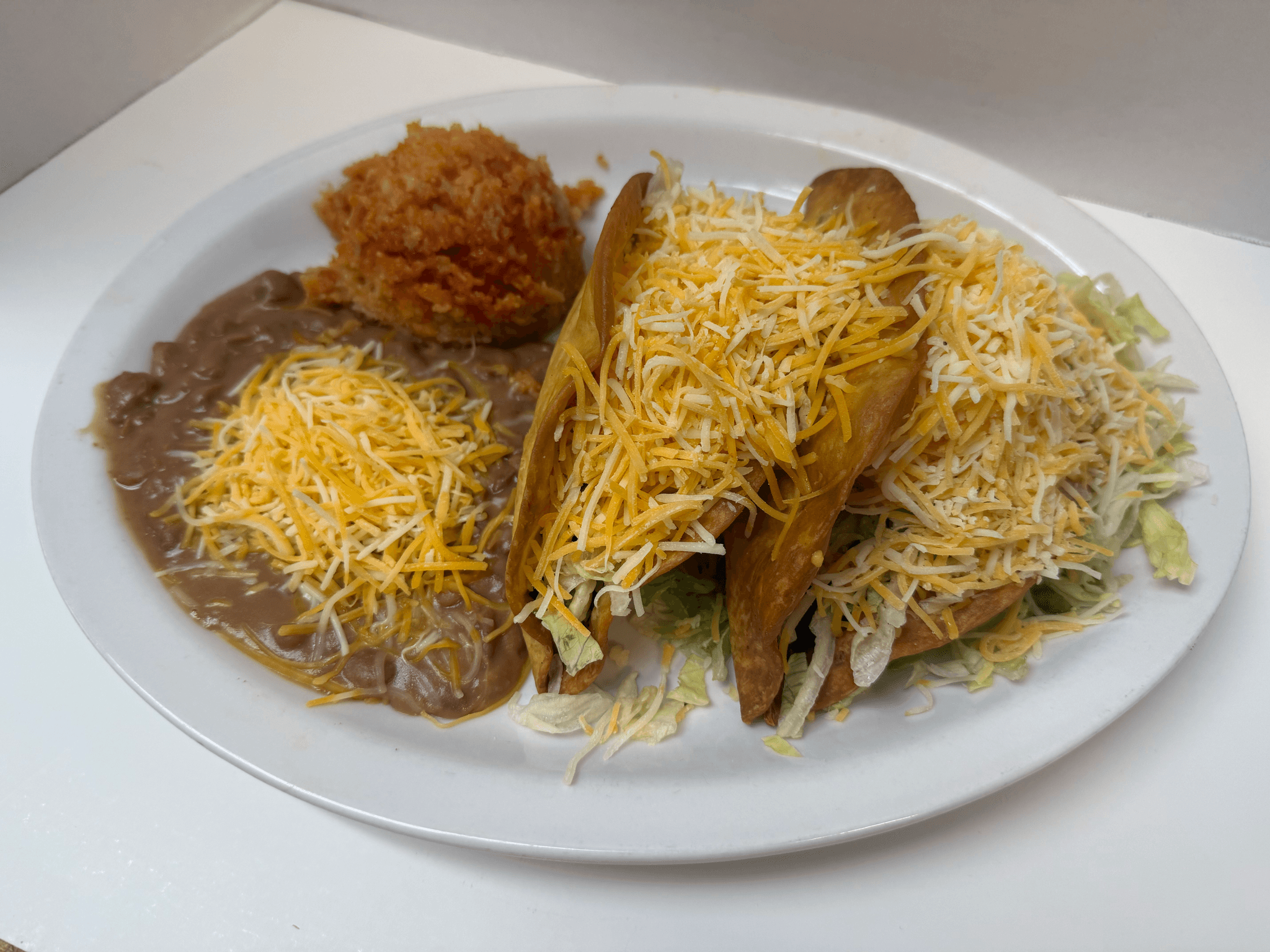 Traditional flour or corn tortillas filled with ground beef, folded and fried crisp, filled with lettuce and cheese. Served with beans & rice
